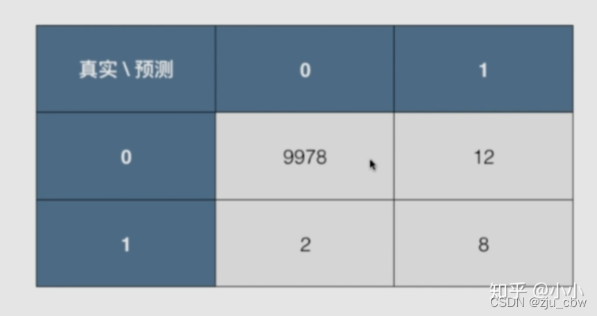 TN:9978个人真实没有癌症,预测没有癌症;FP:12个人真实没有癌症,预测有癌症;FN:2个人真实有癌症,预测没有癌症;TP:8个人真实有癌症,预测也有癌症。