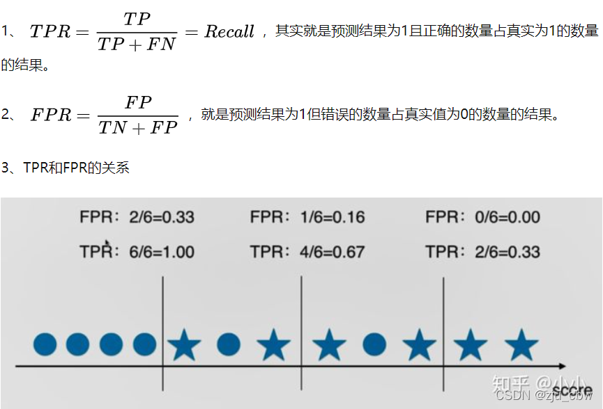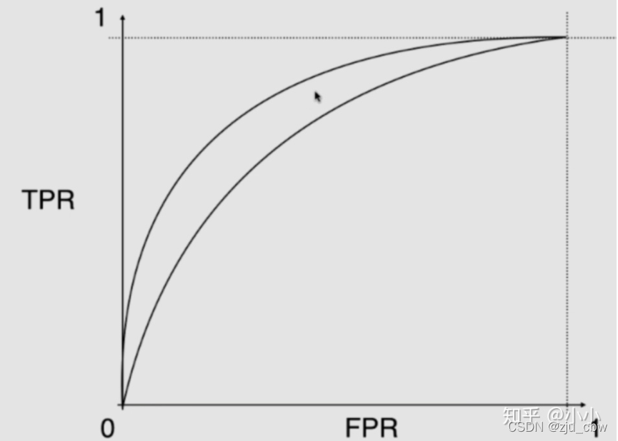 很显然,外面那根曲线上的每一个点都比里面那根曲线的precisions和recalls大,所以整体来说如果PR曲线更靠外,也就更好,因此也可以作为选择算法选择超参数的一种指标。其实就是PR曲线下的面积,来衡量模型的优劣,但是一般情况下都会使用另外一种曲线下的面积。由曲线的下的面积,引出下一个知识点ROC曲线。