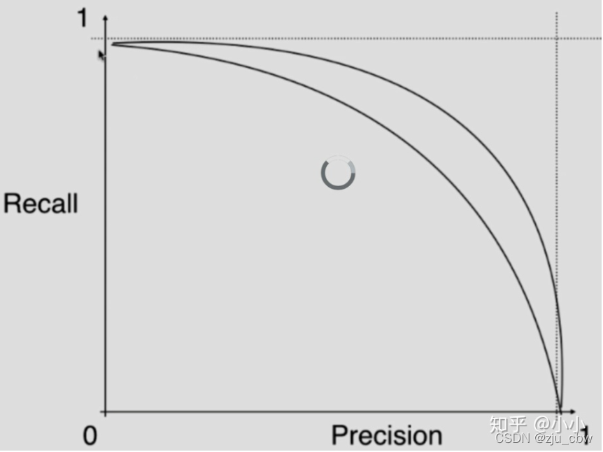 通过精准率和召回率曲线,可以确定合理的阈值去平衡精准率与召回率他们之间的变化关系。而PR曲线中急剧下降的点大概就是最佳平衡点。最后假如使用两种不同的算法绘制出的PR曲线如下图所示,那么哪种算法更优呢?
