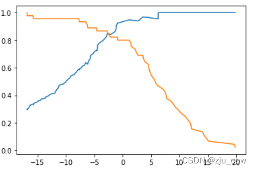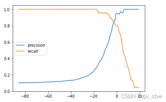 通过上面程序输出结果可以发现返回的精准率和召回率与阈值的长度不一致,这是因为在sklearn中会自动取合适的阈值范围内计算准确率和召回率,而且默认的最大值为1和最小值为0,没有对应的threshold,因此这就是为什么thresholds比precisions和recalls长度少1,因此在绘图的时候需要注意。
