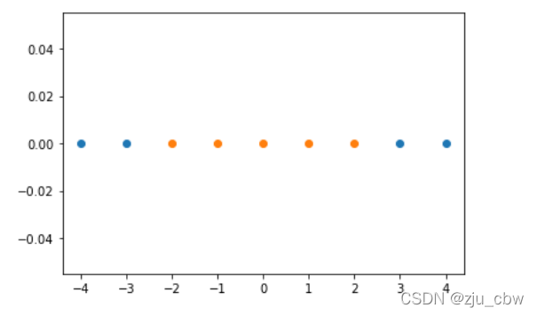 plt.scatter(x[y==0], [0] * len(x[y==0])) plt.scatter(x[y==1], [0] * len(x[y==1])) plt.show()