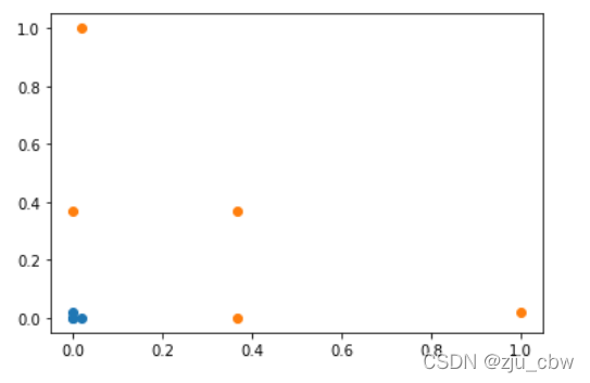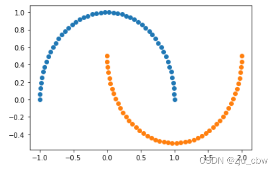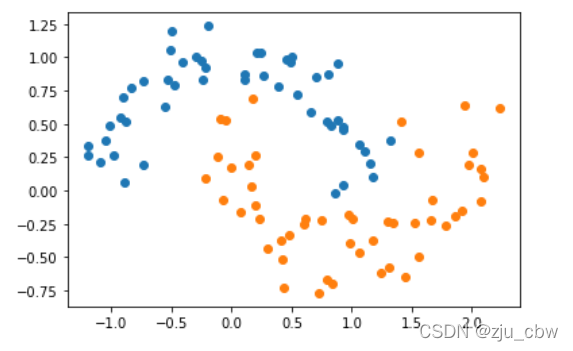 plt.scatter(x_new[y==0, 0], x_new[y==0, 1]) plt.scatter(x_new[y==1, 0], x_new[y==1, 1]) plt.show()