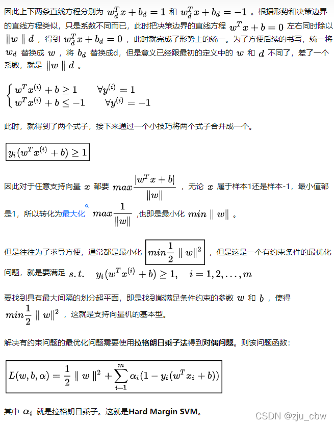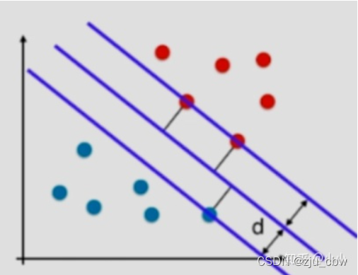 中间那根直线就是决策边界 wTx+b=0 ,而上下两根直线意味着距离一定大于 d,从而