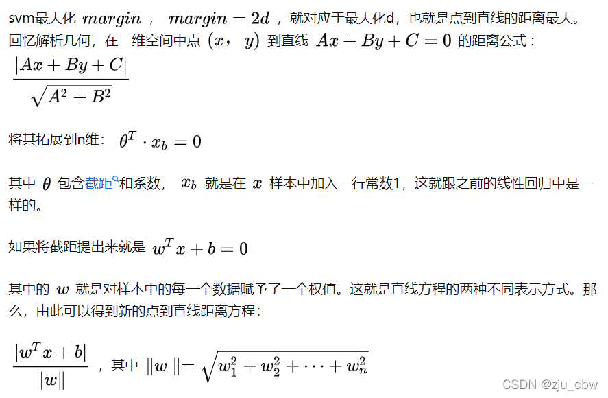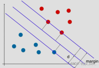 而svm找到的这条直线希望距离最近的红色的点和蓝色的点,距离决策边界尽可能的远,这样就能保证模型的泛化能力。svm尝试寻找一个最优的决策边界,距离两个类别最近的样本最远,图中3个点到决策边界距离相同。这三个点就叫做**支持向量(support vector)**。而平行于决策边界的两条直线之间的距离就是 margin,svm就是要最大化 margin ,这样就把这个问题转化称为最优化问题。