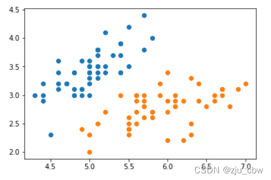 plt.scatter(x[y==0, 0], x[y==0, 1]) plt.scatter(x[y==1, 0], x[y==1, 1]) plt.show()