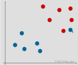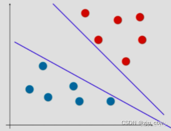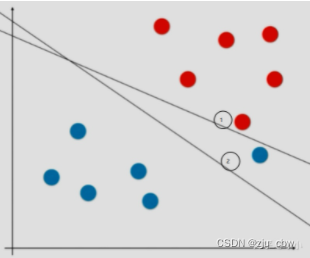如果在实际应用过程中有一个蓝色的点出现在红色的点附近,即两类相对较为接近,但整体跟蓝色的点差异明显,可以看做是一个特殊点或者错误的奇点,此时就会误导,导致最终的hard margin分类边界是直线1,此时模型的泛化能力就值得怀疑。正常来说应该像直线2一样忽略那个极度特殊的蓝点,保证大多数的数据到直线的距离最远,可能这才是最好的分类边界,也就是泛化能力更高。这也能间接地说明如果模型的准确率过高可能会导致模型的过拟合。