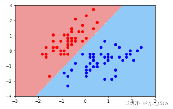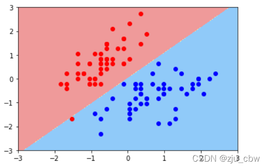 plot_decision_boundary(svc, axis=[-3, 3, -3, 3]) plt.scatter(x_standard[y==0, 0], x_standard[y==0, 1], color='red') plt.scatter(x_standard[y==1, 0], x_standard[y==1, 1], color='blue') plt.show()