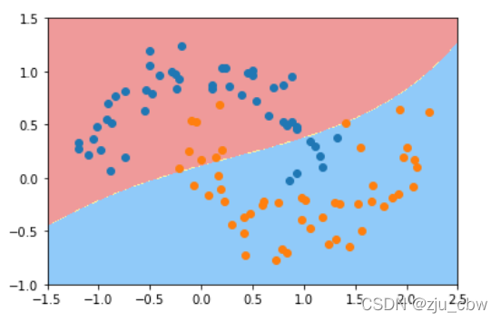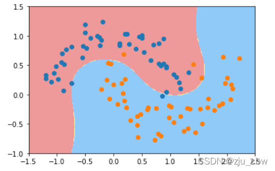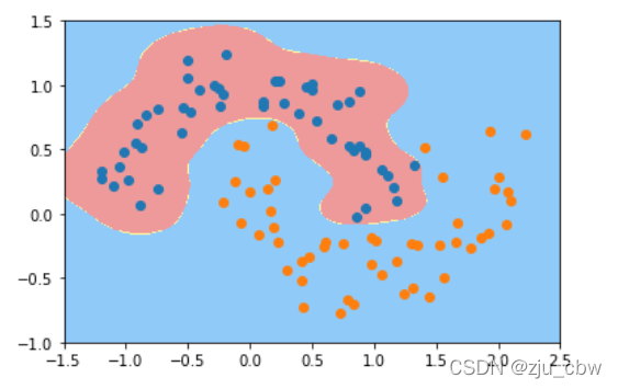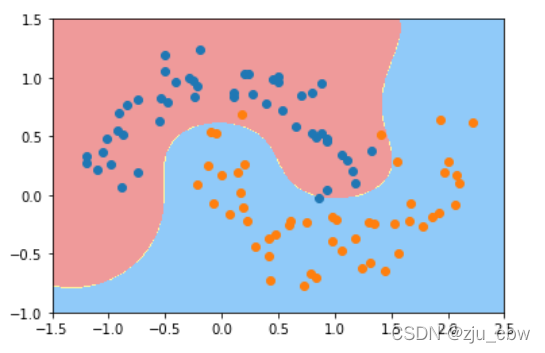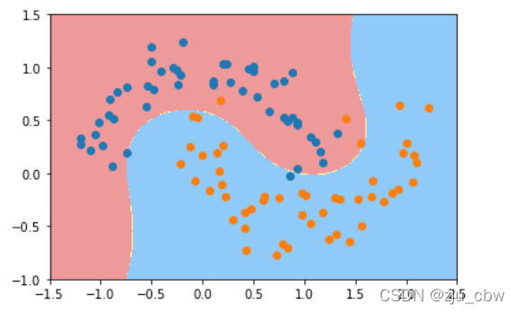 plot_decision_boundary(svc, axis=[-1.5, 2.5, -1.0, 1.5]) plt.scatter(x[y==0, 0], x[y==0, 1]) plt.scatter(x[y==1, 0], x[y==1, 1]) plt.show()