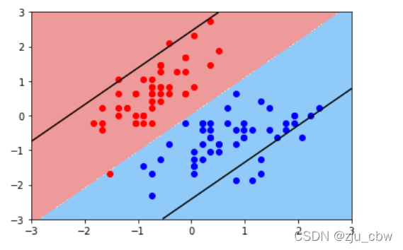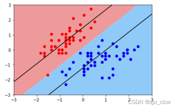 plot_svc_decision_boundary(svc, axis=[-3, 3, -3, 3]) plt.scatter(x_standard[y==0, 0], x_standard[y==0, 1], color='red') plt.scatter(x_standard[y==1, 0], x_standard[y==1, 1], color='blue') plt.show()