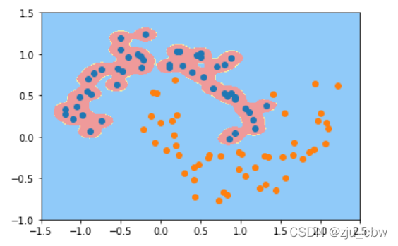 plot_decision_boundary(svc_gamma100, axis=[-1.5, 2.5, -1.0, 1.5]) plt.scatter(x[y==0, 0], x[y==0, 1]) plt.scatter(x[y==1, 0], x[y==1, 1]) plt.show()