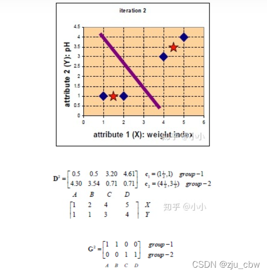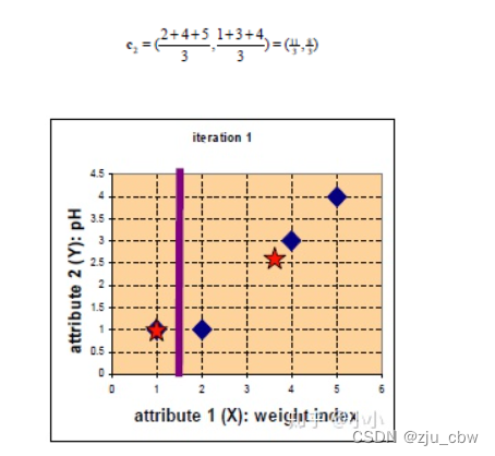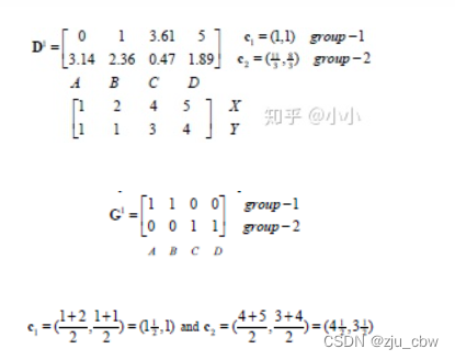 由于归于group1的只有一个点,一次更新后的中心位置 c1=(1,1),而 c2=(11/3, 8/3)