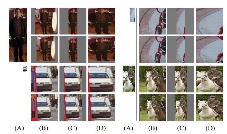最左边为原始目标,B为有上下文最紧方形,C为没有上下文的最紧方形,D为直接缩放为方形(可以看到有明显失真)。上排位0像素填充,下排位16像素填充。