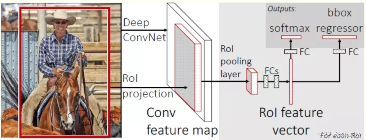 Fast R-CNN借鉴了 SPPNet 的 spatial pyramid pooling layer ,并简化为只有一个固定范围的 RoI pooling layer。并进一步升级,将网络之间统一训练(分类+边框回归),不仅大大提高了训练与测试的速度,而且小幅地提高了mAP。